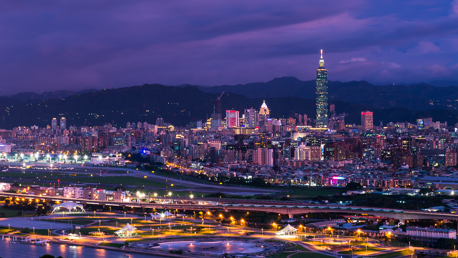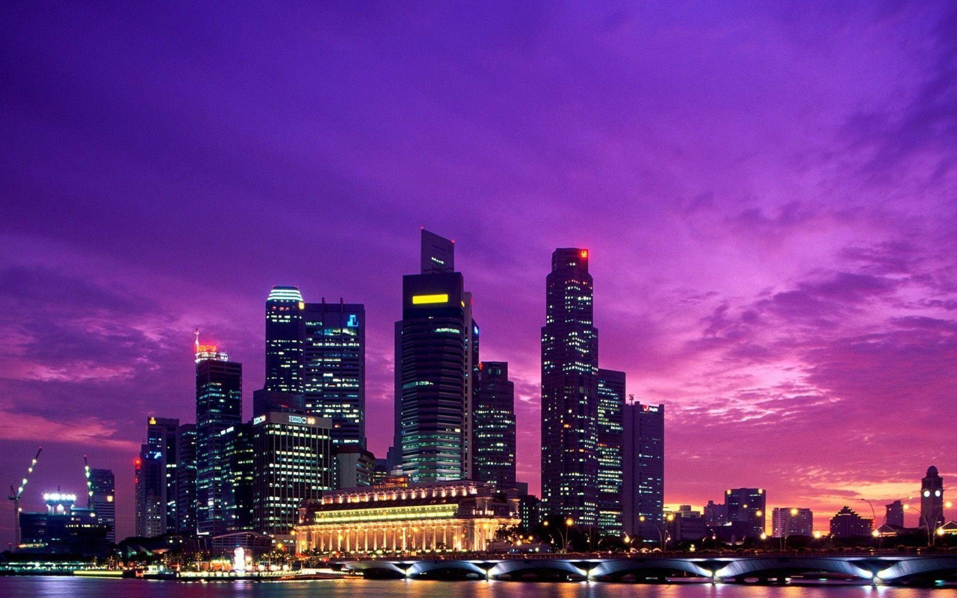 purple skyline water bridges cityscapes wallpaperup