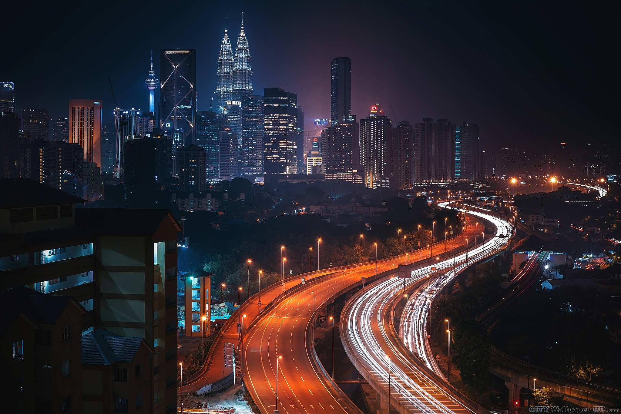 malaysia night kuala lumpur skyscraper highway background building wallpapers